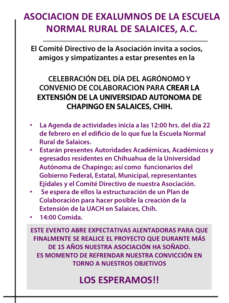 Durante más de 15 años la Asociación de exalumnos de la Normal Rural de Salaices ha promovido diversas alternativas de tipo académico para ser implementadas en lo que fue la extinta escuela Normal Rural de Salaices .