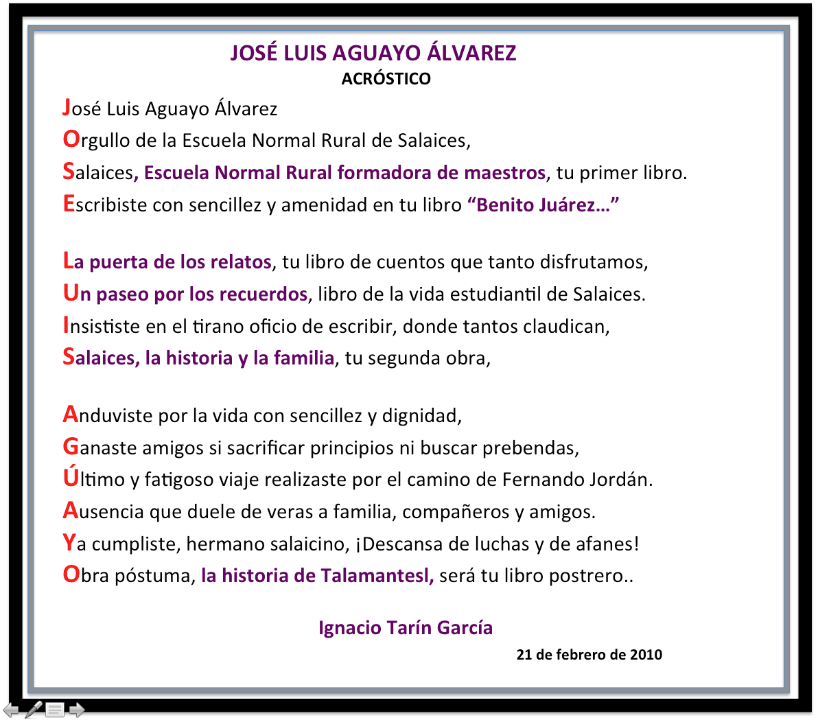… Y cuantas cosas más podríamos comentar de la vida y obra de este ilustre egresado de la Normal Rural de Salaices, misma que “Hoy se encuentra con las alas rotas/ Rodeada de hirientes abrojos…” etc., etc… como dice el compañero Alberto Hinojos en sus REMEMBRANZAS.